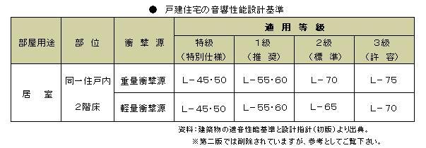 また 固体音を遮断する能力を衝撃音性能と呼びL値(上階の衝撃音が下階で聞える大きさを示す数値)で表します。