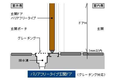 玄関ドアには、旧住宅金融公庫のバリアフリー住宅工事仕様に準じた高低差の玄関ドアと、車椅子対応が可能な高低差3mm以内(グレーチング対応)に納められる玄関ドアとがあります。